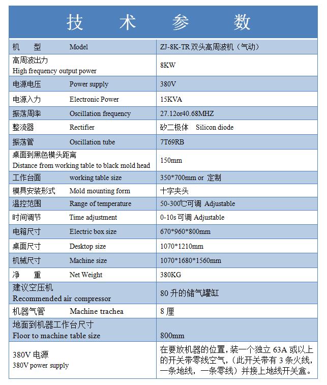 金條包裝雙頭高周波機(jī)符合歐洲第4代環(huán)保標(biāo)準(zhǔn),主要用于各種LOGO壓印,PVC袋子封口,環(huán)保材料封口切邊,以及測(cè)血壓袋,血袋,尿袋,引流袋等等醫(yī)療袋子封口切邊。
