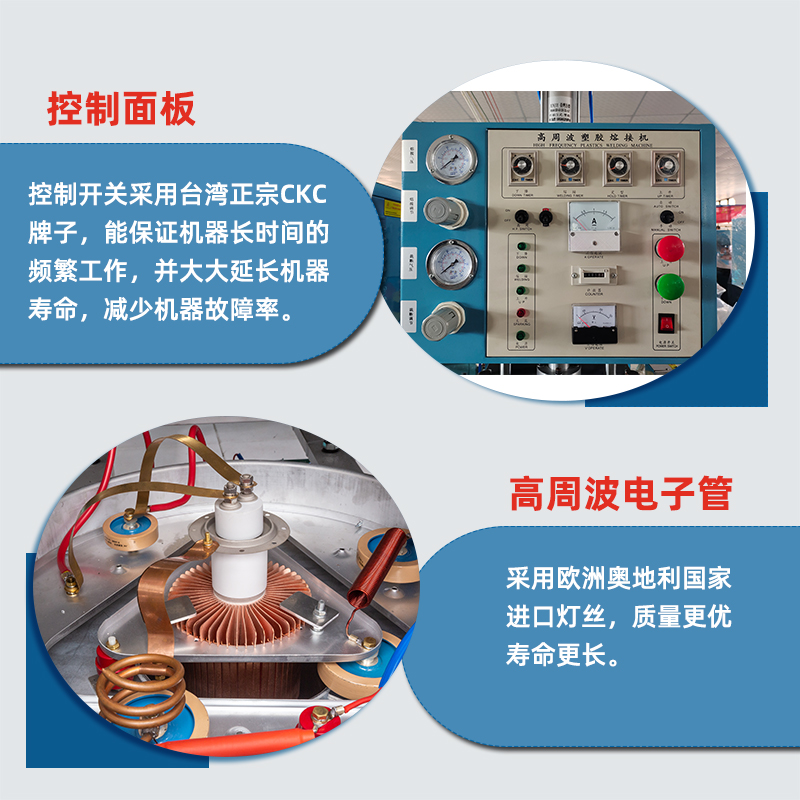 單頭轉(zhuǎn)盤同步熔斷機(jī)型號(hào)為ZJ-8K-YR,此機(jī)裝有進(jìn)口雙管防火花保護(hù)裝置,對(duì)高周波模具及生產(chǎn)產(chǎn)品起到很大的保護(hù)作用,可以把模具打火機(jī)率降低95%,是一款轉(zhuǎn)盤式高周波機(jī),可以單人操作,節(jié)約人工。如果您對(duì)我們公司還想了解更多,那就馬上與我們聯(lián)系吧,無論您什么時(shí)候來電,我們都會(huì)為您解答各類有關(guān)高周波機(jī)的問題。聯(lián)系電話/微信 13927715208 李先生。
