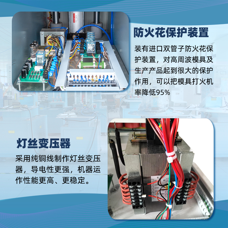 汽車腳墊單邊推盤高周波機高靈敏度進口雙管火花保護裝置,能有效保護模具及產(chǎn)品的缺損,從而大大減少燒壞模具的機率,采用國際大品牌原裝OMRON(歐姆龍)繼電器及臺灣正宗CKC時間制,能保證機器長時間的頻率工作,并大大延長機器壽命,減少機器故障。